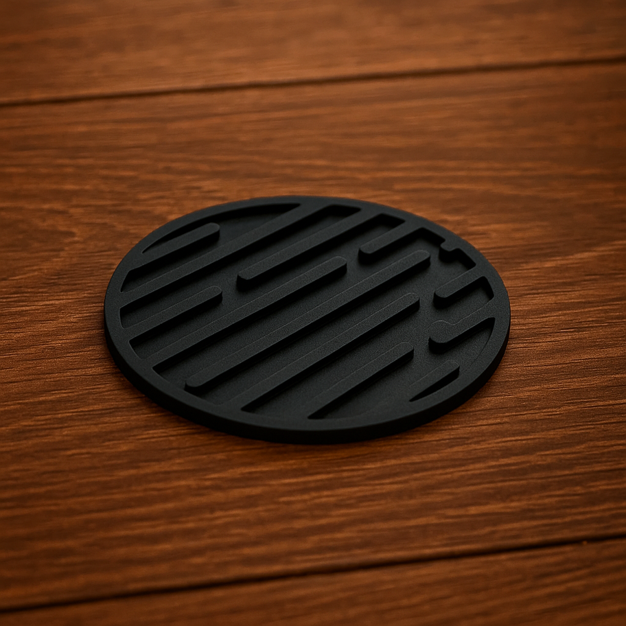 A sleek, grooved coaster designed to catch condensation and protect surfaces. Perfect for cold drinks.